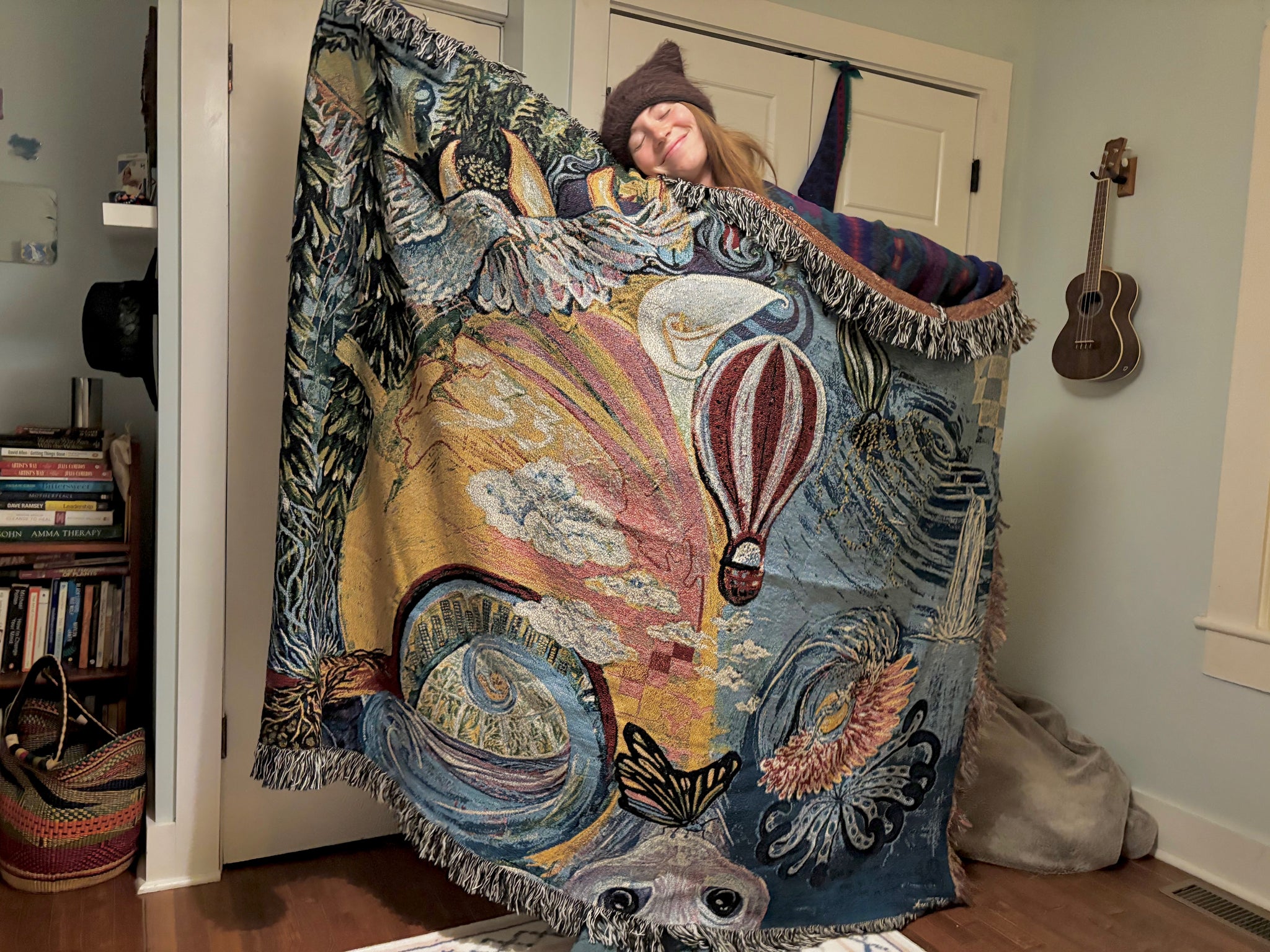 NOTE: The last 2 images are mockups. Refer to first four photos for true colors of blanket. This blanket has a more natural and muted tone than the original painting design.